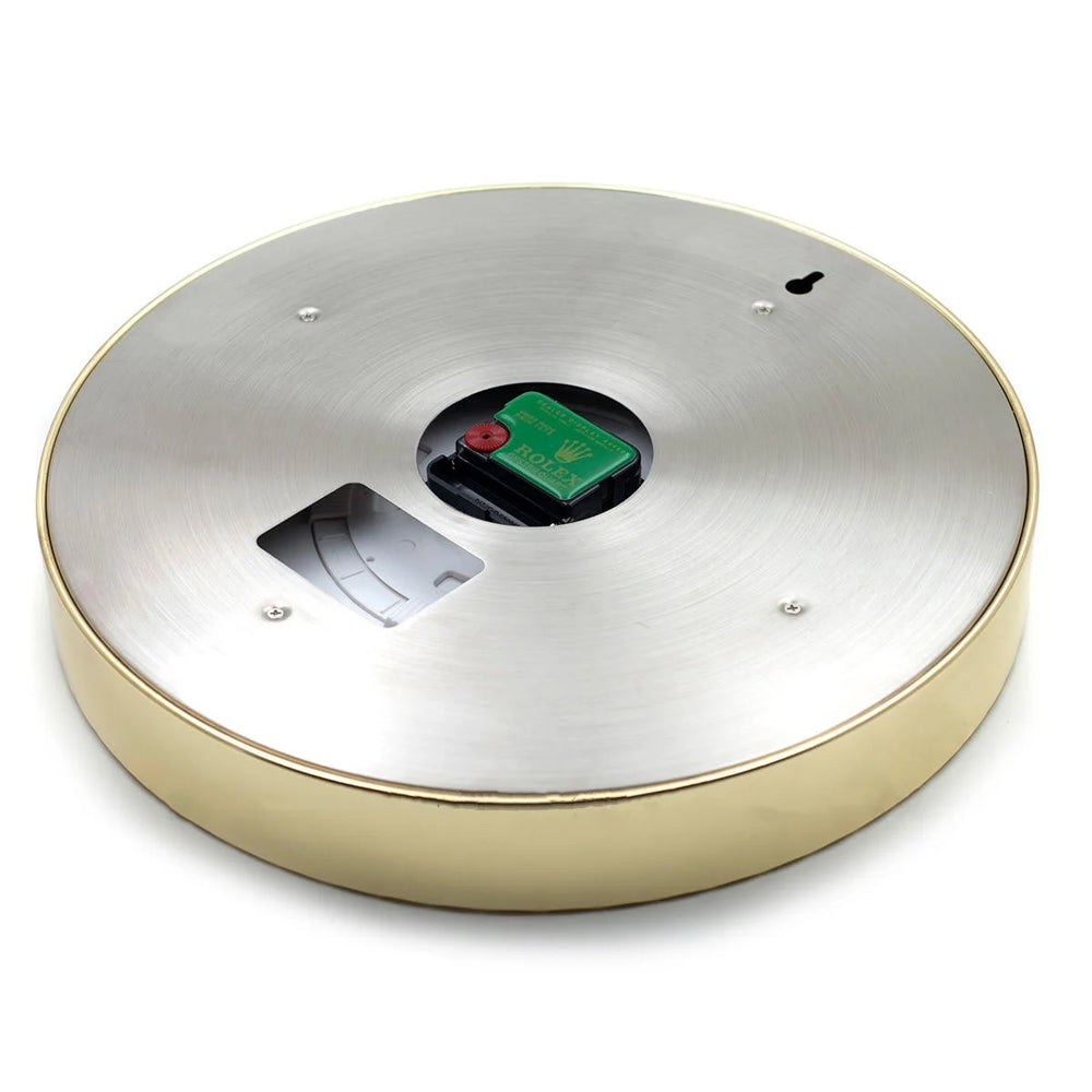 Answer 1: The wall clock features a durable polished gold-tone stainless steel case and a deep black aluminum bezel insert, ensuring both elegance and longevity.